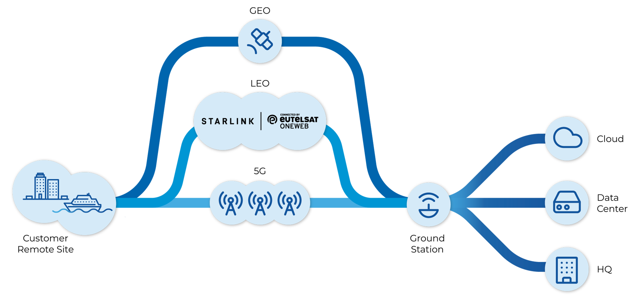 Latency/jitter-aware routing and policy-based traffic steering optimize application performance across satellite, 5G, and terrestrial links.
