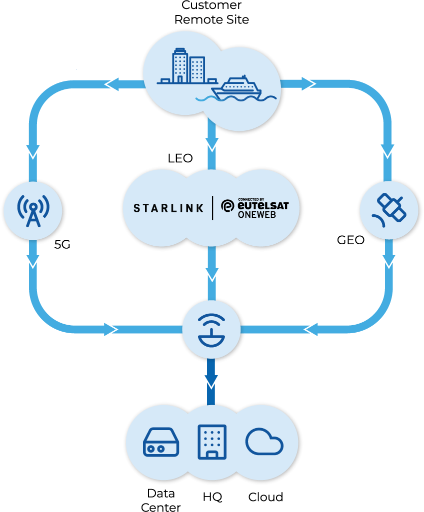 Support for OneWeb, GEO VSAT, and terrestrial carriers. Mix and match per site for availability, performance, or cost goals.